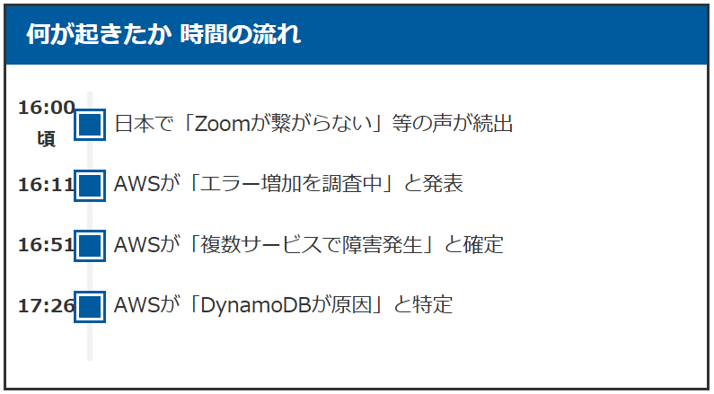 アメリカで深夜に起きた障害ですが、日本では平日の午後という最悪のタイミング。