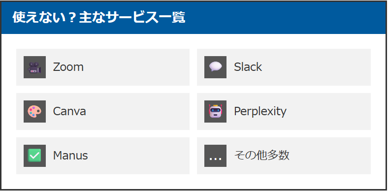 | Slack | 社内チャット | メッセージが送れない、開けない |