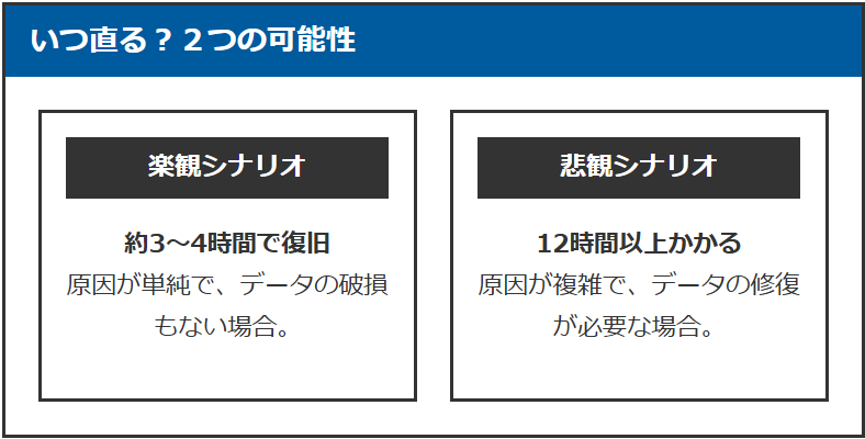 一気に全部が直るのではなく、重要なサービスから順番に復旧していくと予想されます。「さっきよりちょっと繋がるようになった」という状態から、徐々に安定していくイメージです。