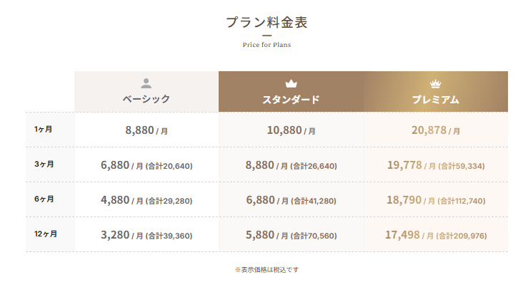| プラン名 | 1ヶ月 | 3ヶ月 | 6ヶ月 | 12ヶ月 |