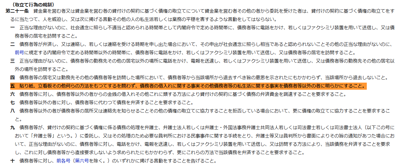 五 貼り紙、立看板その他何らの方法をもつてするを問わず、債務者の借入れに関する事実その他債務者等の私生活に関する事実を債務者等以外の者に明らかにすること。 貸金業法(昭和五十八年法律第三十二号)第二十一条より