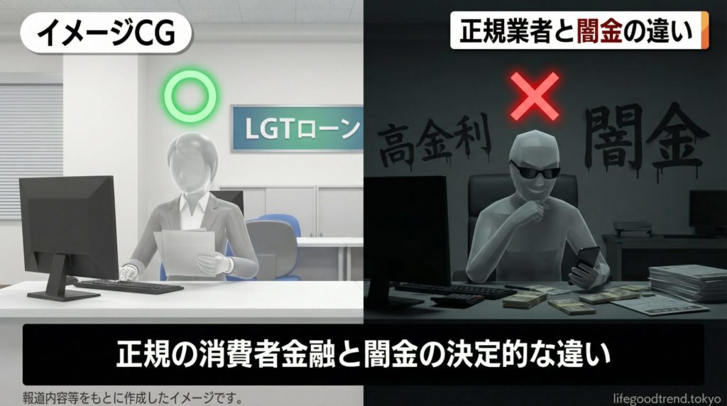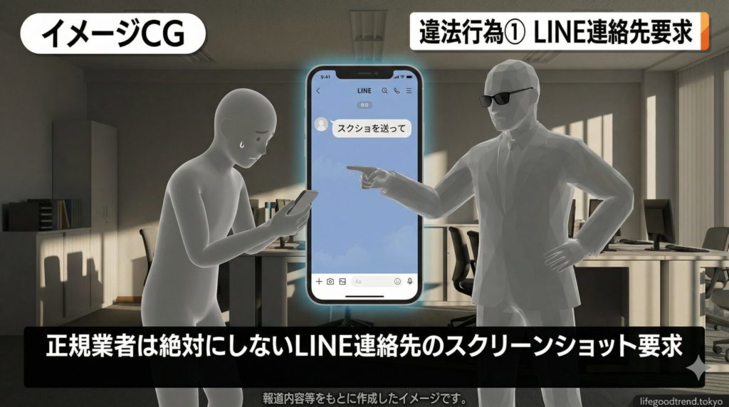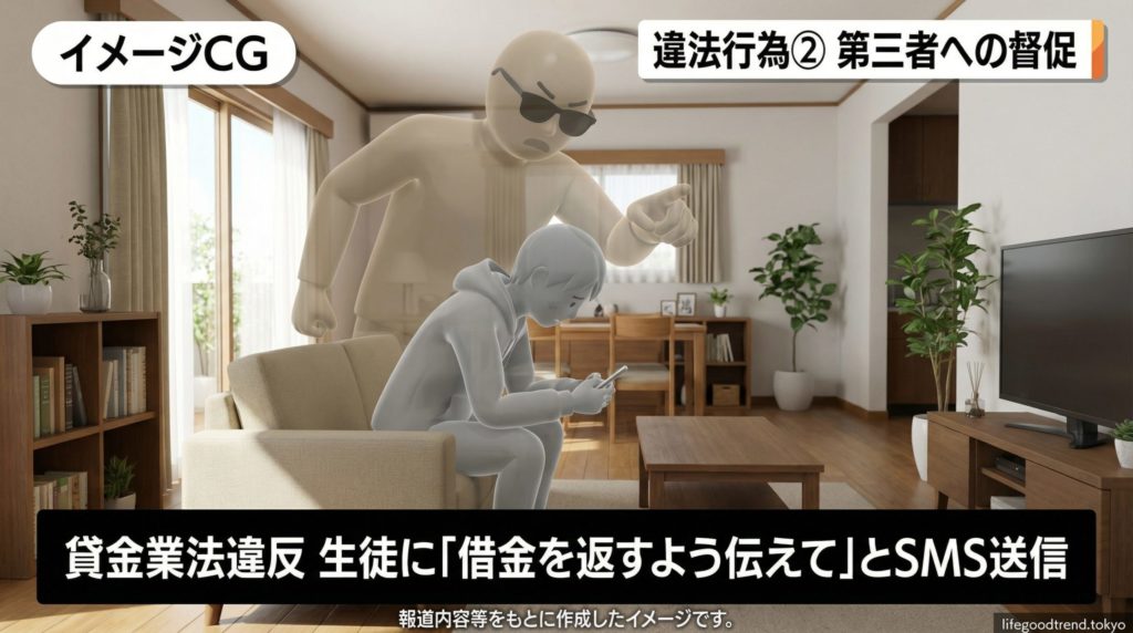 報道では「消費者金融業者」とされていますが、LINEで連絡先を要求し、第三者に督促SMSを送る行為は貸金業法違反であり、正規業者が絶対にやらないことです。